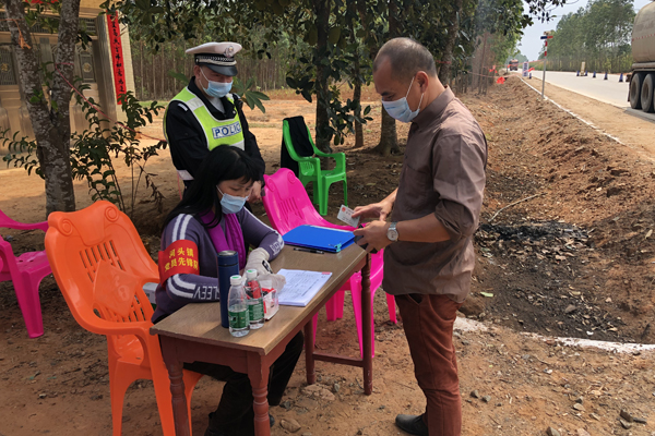 全國(guó)人大代表、湛江市遂溪縣吾良村婦女主任劉小權(quán)(左一)在村口設(shè)立黨員值班崗哨,對(duì)來(lái)往車(chē)輛及人員進(jìn)行摸排登記和體溫監(jiān)測(cè),勸退勸返村民走親訪友、聚眾聚餐。
