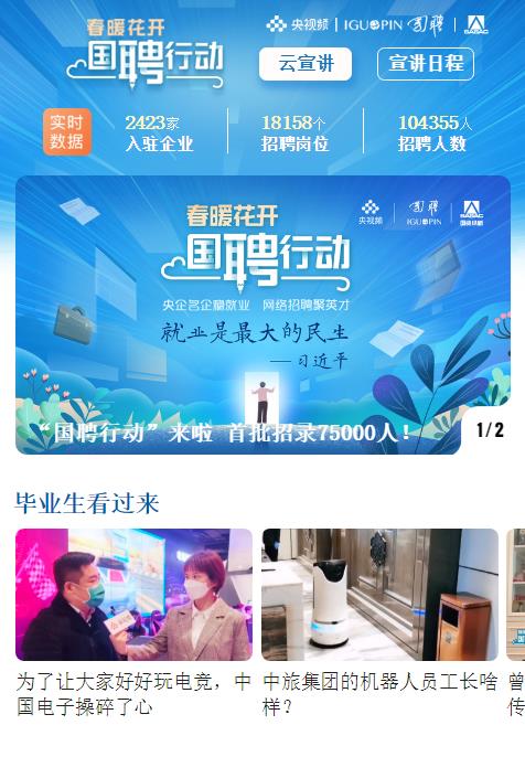 “國(guó)聘行動(dòng)”上線以來,已成功舉辦了18場(chǎng)網(wǎng)絡(luò)“云宣講”,累計(jì)求職頁面瀏覽量突破1000萬,投遞簡(jiǎn)歷30多萬份。十大軍工企業(yè)、三大航空公司、三大電信運(yùn)營(yíng)商、各大電力企業(yè)等中央企業(yè)紛紛匯聚,萬科、騰訊、京東、阿里、拼多多等知名民企紛紛參與,企業(yè)負(fù)責(zé)人在線答疑,釋放了大量就業(yè)崗位。
