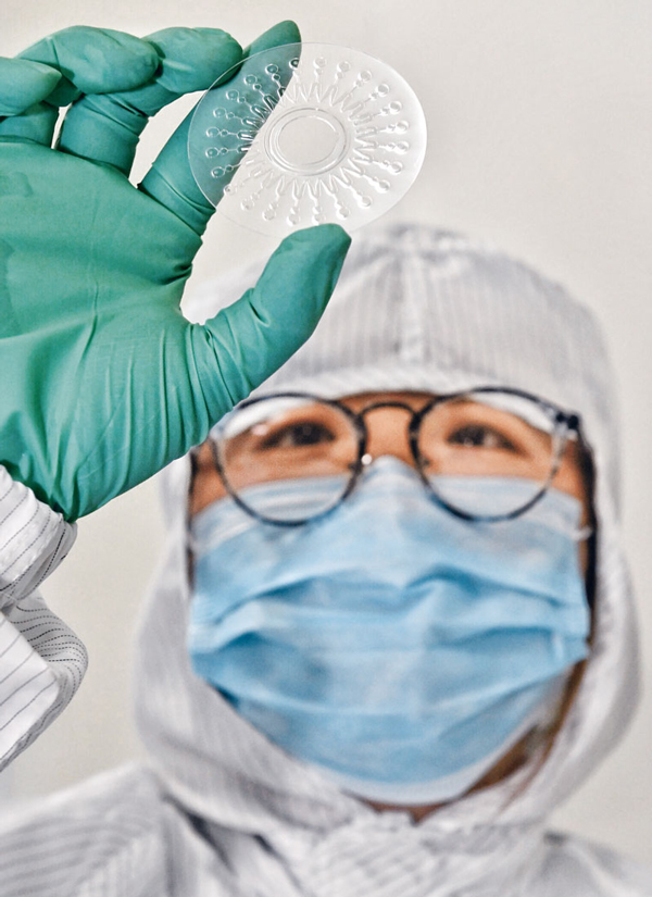 由國(guó)內(nèi)幾家科研機(jī)構(gòu)聯(lián)合攻關(guān)開(kāi)發(fā)的包括新冠病毒在內(nèi)的呼吸道病毒(6種)核酸檢測(cè)試劑盒(恒溫?cái)U(kuò)增芯片法),只需采集患者的鼻、咽拭子等分泌物樣本,在1.5小時(shí)內(nèi)便可一次性檢測(cè)包括新冠病毒在內(nèi)的6種呼吸道病毒。圖為科技人員在展示恒溫?cái)U(kuò)增芯片。新華社記者 劉坤/攝