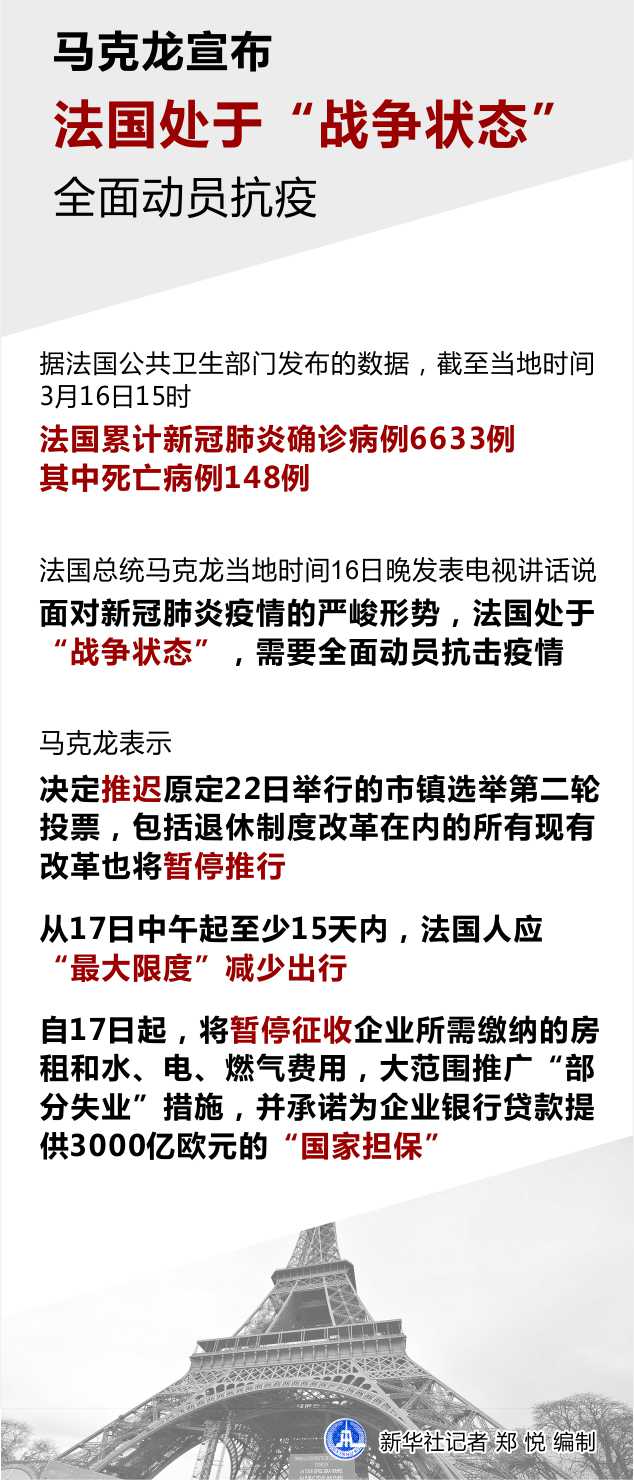 新華社巴黎3月16日電(記者徐永春 唐霽 陳晨)法國總統(tǒng)馬克龍16日晚發(fā)表電視講話說,面對新冠肺炎疫情的嚴(yán)峻形勢,法國處于“戰(zhàn)爭狀態(tài)”,需要全面動(dòng)員抗擊疫情。