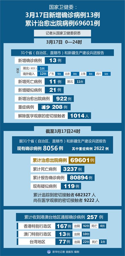 截至3月17日24時,據(jù)31個?。ㄗ灾螀^(qū)、直轄市)和新疆生產(chǎn)建設兵團報告,現(xiàn)有確診病例8056例(其中重癥病例2622例),累計治愈出院病例69601例,累計死亡病例3237例,累計報告確診病例80894例,現(xiàn)有疑似病例119例。累計追蹤到密切接觸者682327人,尚在醫(yī)學觀察的密切接觸者9222人。