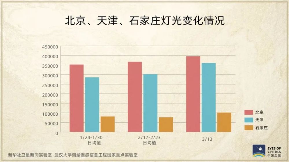 這是3月13日京津冀地區(qū)夜間燈光分布情況。在全力做好北京疫情防控工作、維護(hù)首都安全穩(wěn)定的大背景下,京津冀地區(qū)夜間燈光亮度仍達(dá)到春節(jié)期間的1.28倍。