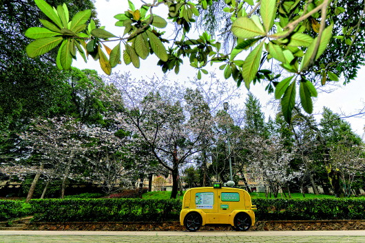 ▲一輛5G無人攝像車在武漢大學(xué)櫻花大道進行不間斷無人巡游,實時采集和傳輸直播圖像信號。(3月16日攝) 新華社記者費茂華攝