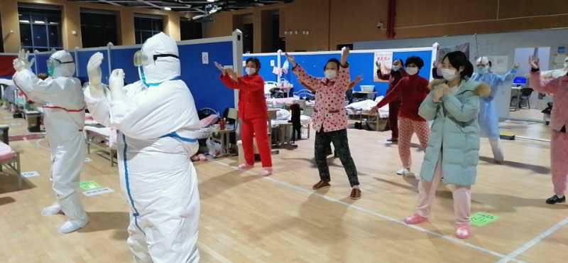 青海醫(yī)護人員帶領患者們一起做運動。青海省支援湖北護理醫(yī)療隊供圖
