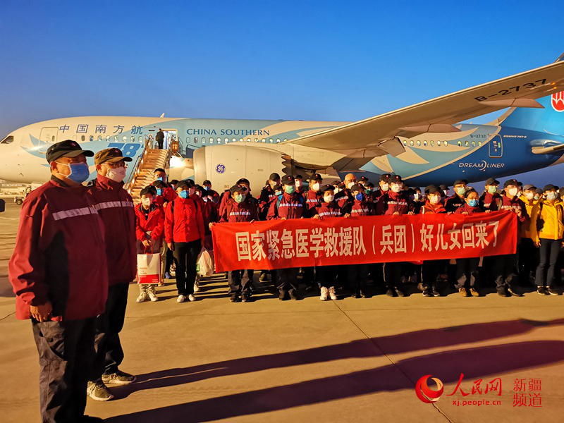 新疆生產(chǎn)建設兵團支援湖北醫(yī)療隊抵達烏魯木齊機場。陳新輝攝