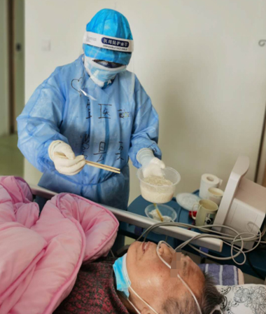 我所在的湖北婦幼保健院光谷院區(qū)感染二科是重癥科室,病人基本都是生活不能自理的老奶奶、老爺爺。除了日常的護(hù)理工作---輸液、動(dòng)靜脈采血、插胃管、導(dǎo)尿管、檢測(cè)呼吸機(jī)、搶救病人、病房的洗消、垃圾的處理外,還要喂飯、喂藥,換尿不濕。因?yàn)檎Z(yǔ)言不通(老人家說武漢方言),還要連說帶比劃,半天才能搞明白爺爺奶奶們想要表達(dá)的意思。一個(gè)班下來,渾身都是汗快要累癱了,但是耳邊老爺爺老奶奶的話語(yǔ),“孩子,謝謝你”,那時(shí)候我的心里倍感欣慰,感覺渾身都是勁。