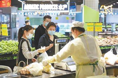 3月22日,在洪山區(qū)中百倉儲光谷購物廣場,記者看到超市已經(jīng)恢復正常營業(yè)。為保障顧客健康安全,超市采取了出示綠色健康碼或社區(qū)健康證明、測量體溫、每日限流等舉措。據(jù)悉,3月20日,武漢市商務局通報,根據(jù)武漢市疫情防控指揮部有關工作組決定,自即日起,無疫情小區(qū)和社區(qū)將有限放行,商業(yè)設施和商業(yè)網(wǎng)點將逐步有序開放。圖一:顧客正在將蔬菜等商品過秤;圖二:進入超市前,顧客正在排隊登記個人信息并檢測體溫。(記者 張武軍攝)