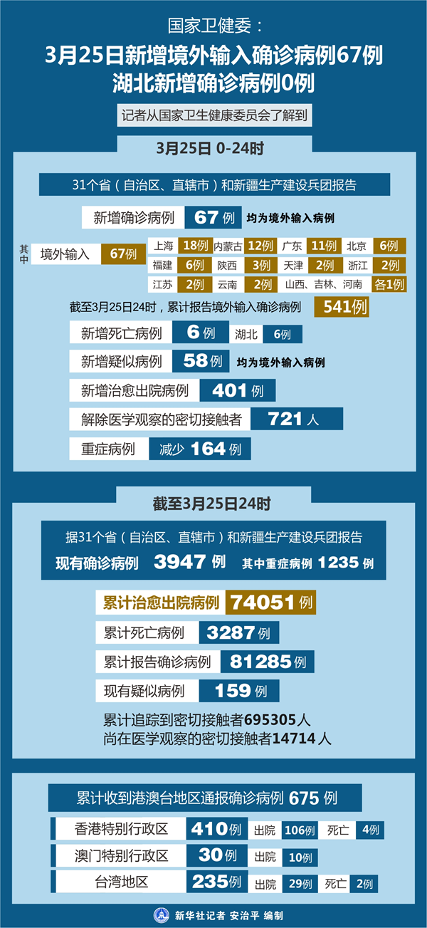 截至3月25日24時,據(jù)31個?。ㄗ灾螀^(qū)、直轄市)和新疆生產(chǎn)建設(shè)兵團報告,現(xiàn)有確診病例3947例(其中重癥病例1235例),累計治愈出院病例74051例,累計死亡病例3287例,累計報告確診病例81285例,現(xiàn)有疑似病例159例。累計追蹤到密切接觸者695305人,尚在醫(yī)學觀察的密切接觸者14714人。