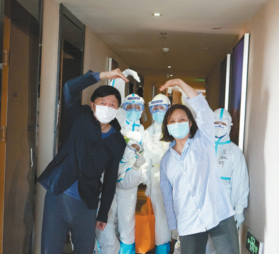 在麗楓康復驛站隔離區(qū),即將出站的康復者與醫(yī)護人員合影。本報記者 申少鐵攝