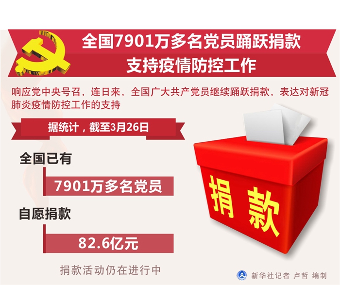 新華社北京3月28日電 響應(yīng)黨中央號召,連日來,全國廣大共產(chǎn)黨員繼續(xù)踴躍捐款,表達(dá)對新冠肺炎疫情防控工作的支持。據(jù)統(tǒng)計(jì),截至3月26日,全國已有7901萬多名黨員自愿捐款82.6億元。捐款活動仍在進(jìn)行中。