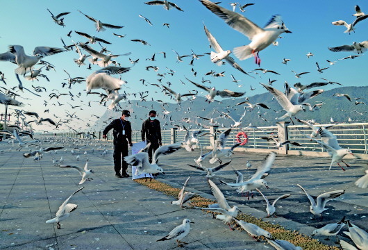 盡管疫情期間景區(qū)公園關閉,不能與紅嘴鷗相見,但春城人仍掛念這些老朋友。許多市民背來一袋袋鷗糧,請工作人員代喂。