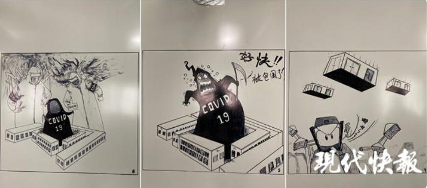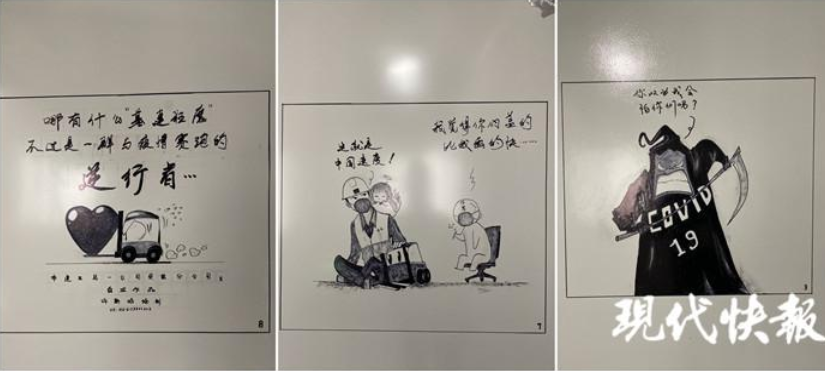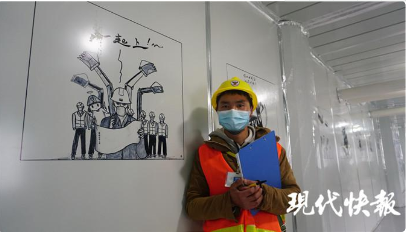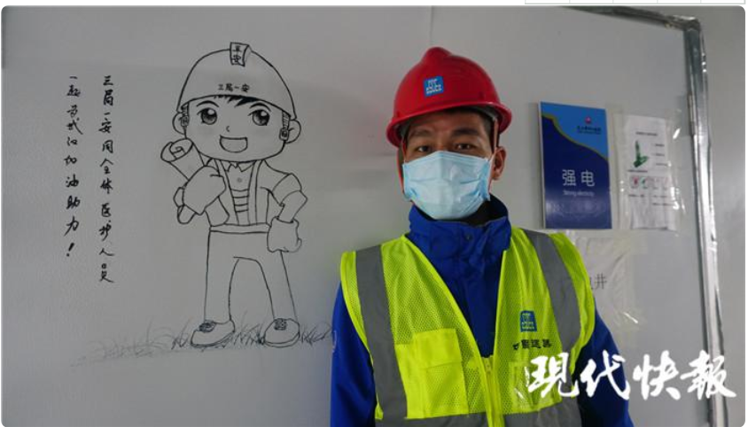 許新焰看到醫(yī)護人員通道的一面墻空著,就用一組漫畫,把中建三局建設醫(yī)院對抗 " 疫魔 " 的過程,用9幅漫畫體現(xiàn)出來。" 就是想給醫(yī)護人員、志愿者和我們這些維保隊員力量,我們用幾天時間就把醫(yī)院建起來了,這樣的速度,不怕疫魔。" 他說,每幅漫畫大約需要耗費一兩個小時,有時畫著畫著就要出工,前前后后花了七八天的時間,才把整組漫畫全部畫完。