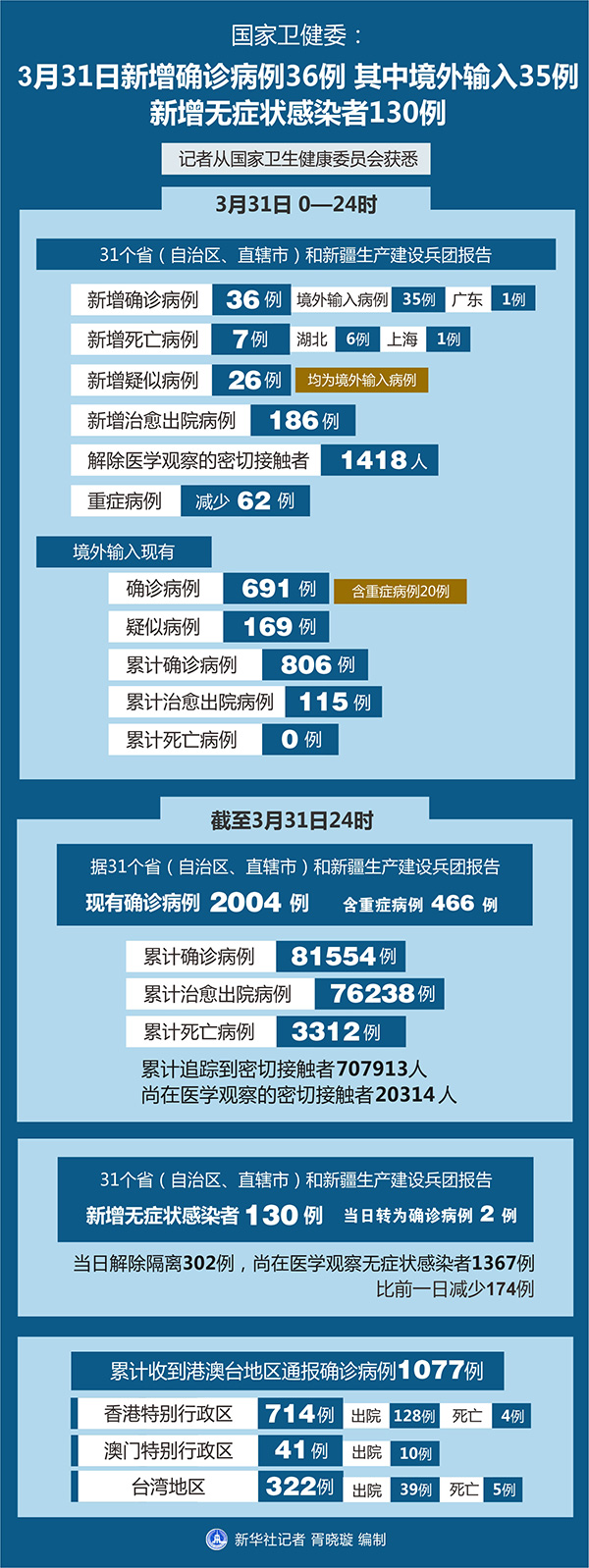 截至3月31日24時,據(jù)31個?。ㄗ灾螀^(qū)、直轄市)和新疆生產(chǎn)建設兵團報告,現(xiàn)有確診病例2004例(含重癥病例466例),現(xiàn)有疑似病例172例。累計確診病例81554例,累計治愈出院病例76238例,累計死亡病例3312例,累計追蹤到密切接觸者707913人,尚在醫(yī)學觀察的密切接觸者20314人。
