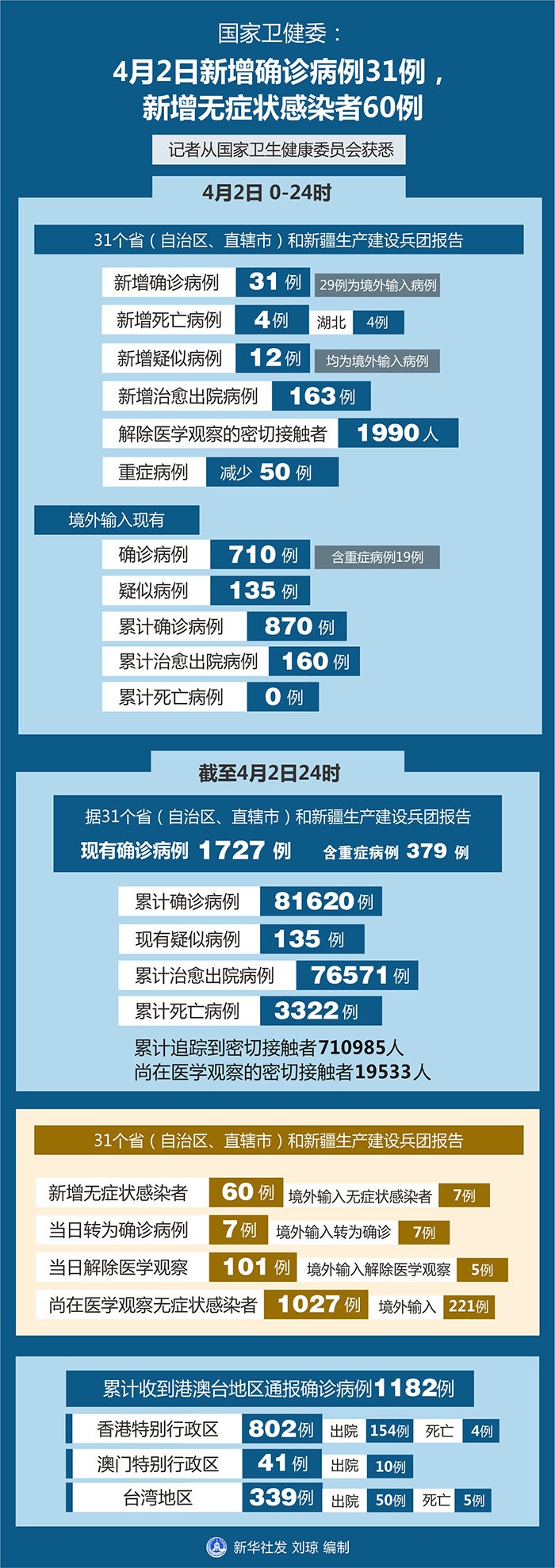 截至4月2日24時,據(jù)31個省(自治區(qū)、直轄市)和新疆生產(chǎn)建設(shè)兵團報告,現(xiàn)有確診病例1727例(其中重癥病例379例),累計治愈出院病例76571例,累計死亡病例3322例,累計報告確診病例81620例,現(xiàn)有疑似病例135例。累計追蹤到密切接觸者710985人,尚在醫(yī)學(xué)觀察的密切接觸者19533人。