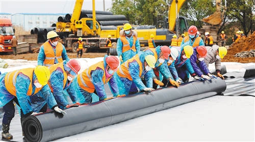 中建三局火神山醫(yī)院建設(shè)者在施工現(xiàn)場(chǎng)鋪設(shè)“兩布一膜”防護(hù)層。 (資料照片)