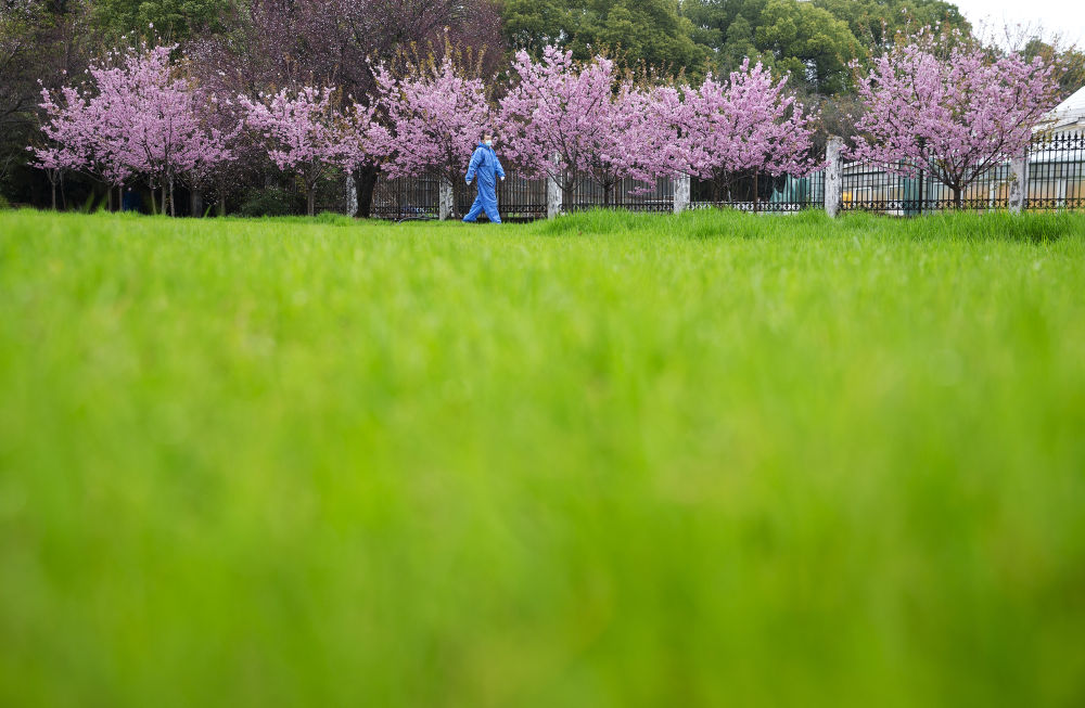 ↑3月3日,一名工作人員從盛開(kāi)的櫻花樹下走過(guò)。由于學(xué)校進(jìn)行封閉管理,我在這幾顆櫻花樹旁等了一個(gè)多小時(shí),只遇到了兩個(gè)人。