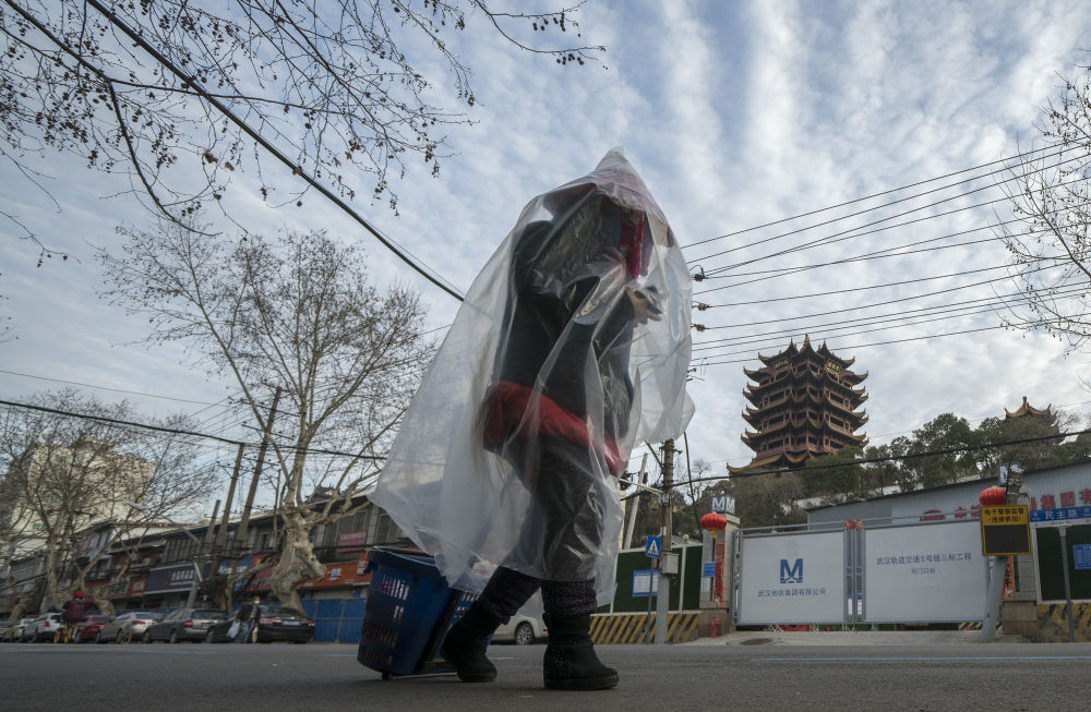 ↑3月15日,一位身穿自制“防護(hù)服”的女士上街買菜時(shí)從黃鶴樓下走過(guò)。她說(shuō)她近兩個(gè)月來(lái),只出過(guò)兩次門。