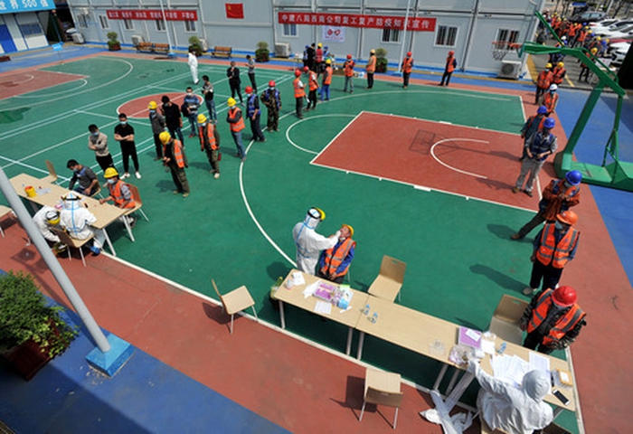 在中建八局武漢中央文化區(qū)萬達(dá)項(xiàng)目部,返崗員工4月7日在接受核酸和抗體指標(biāo)檢測。 新華社發(fā)(史偉 攝)