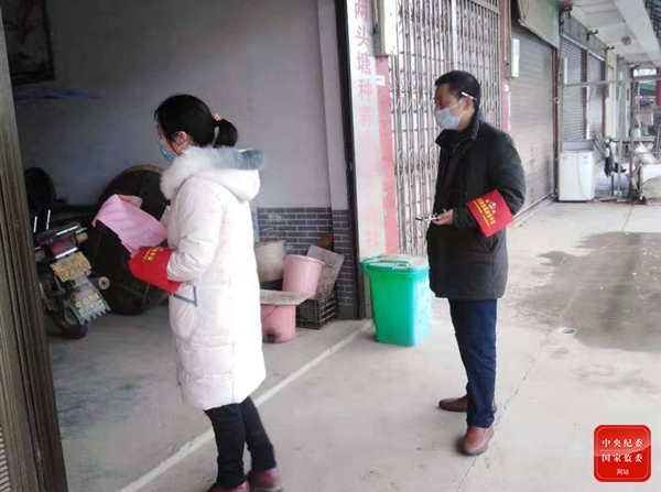 2月11日,向衛(wèi)煌和荷葉鎮(zhèn)兩頭塘村村干部上門向村民發(fā)放宣傳單,宣傳疫情防控知識(shí)。