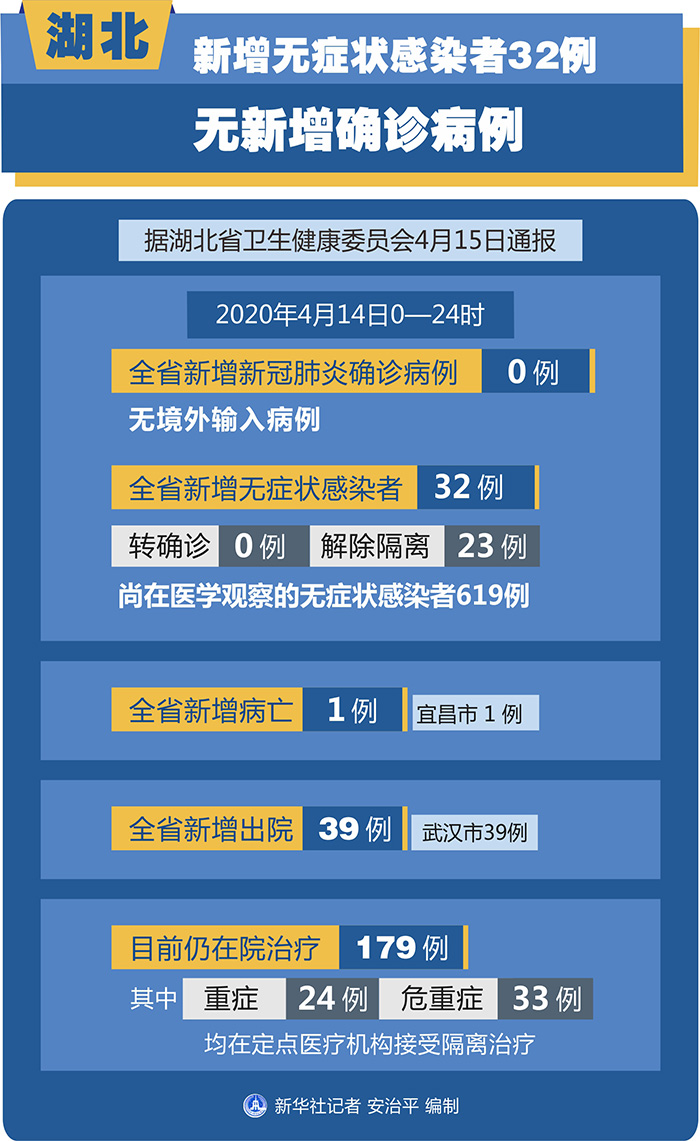 新華社武漢4月15日電(記者李偉、王作葵)據(jù)湖北省衛(wèi)生健康委員會15日通報,2020年4月14日0—24時,全省新增新冠肺炎確診病例0例,無境外輸入病例。全省新增無癥狀感染者32例,轉(zhuǎn)確診0例,解除隔離23例,尚在醫(yī)學觀察的無癥狀感染者619例。