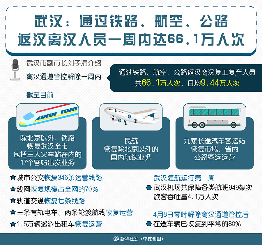 新華社武漢4月15日電(記者李偉、王作葵)武漢市副市長(zhǎng)劉子清介紹,離漢通道管控解除一周內(nèi),通過鐵路、航空、公路返漢離漢復(fù)工復(fù)產(chǎn)人員共66.1萬人次,日均9.44萬人次。