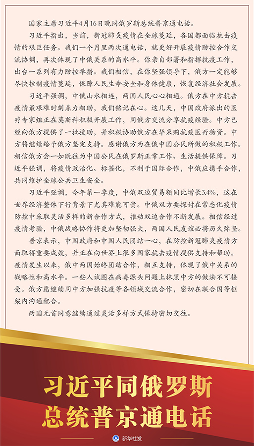 習(xí)近平強(qiáng)調(diào),中俄山水相連,兩國人民心心相通。俄方在中方抗擊疫情最艱難時刻鼎力相助,我們銘記在心。這幾天,中國政府派出的醫(yī)療專家組正在莫斯科積極開展工作,同俄方交流分享抗疫經(jīng)驗。中方已經(jīng)向俄方提供了一批援助,并積極協(xié)助俄方在華采購抗疫醫(yī)療物資。中方將繼續(xù)給予俄方堅定支持。感謝俄方為在俄中國公民所做的積極工作。相信俄方會一如既往為中國公民在俄羅斯正常工作、生活提供保障。習(xí)近平強(qiáng)調(diào),將疫情政治化、標(biāo)簽化,不利于國際合作,中俄應(yīng)攜手合作,共同維護(hù)全球公共衛(wèi)生安全。