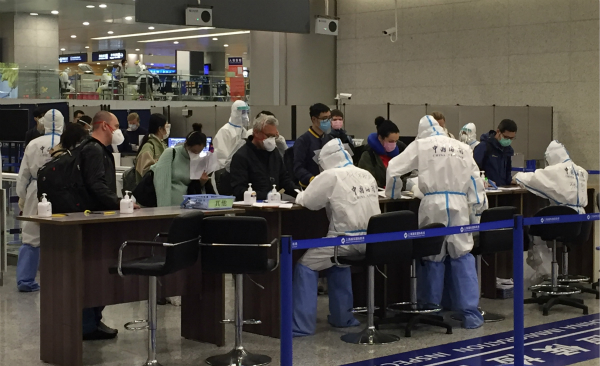海關(guān)關(guān)員在上海浦東國(guó)際機(jī)場(chǎng)對(duì)入境旅客進(jìn)行流行病學(xué)調(diào)查。新華社發(fā)(吳宇 攝)