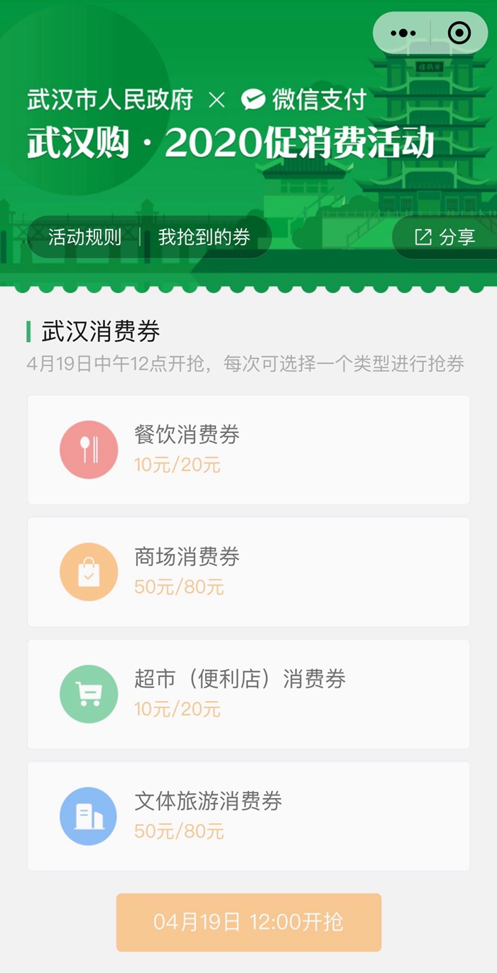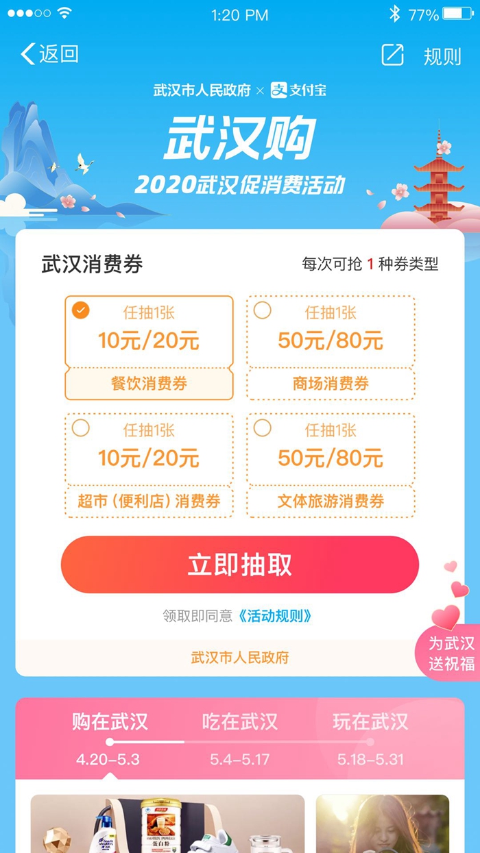 根據(jù)安排,“武漢消費券”將在阿里巴巴、美團(tuán)點評、騰訊等3家企業(yè)自有線上平臺上按周投放,總體投放分兩期執(zhí)行。其中,第一期為4月19日至5月31日,首次投放活動將在4月19日中午12時進(jìn)行,在漢人員可登錄支付寶、美團(tuán)、大眾點評、微信等手機(jī)程序,搜索“武漢”“消費券”等關(guān)鍵詞進(jìn)入活動頁面參與領(lǐng)券。第二期為6月1日至7月31日,具體投放時間另行公布。