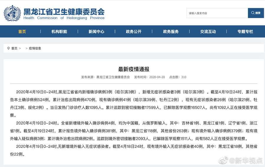 2020年4月19日0-24時(shí),黑龍江省省內(nèi)新增確診病例3例(哈爾濱3例),新增無癥狀感染者3例(哈爾濱3例)。截至4月19日24時(shí),累計(jì)報(bào)告本土確診病例524例,累計(jì)治愈出院病例470例,現(xiàn)有確診病例41例(哈爾濱39例、牡丹江2例),現(xiàn)有無癥狀感染者26例(哈爾濱21例、牡丹江3例、綏化2例)。當(dāng)日發(fā)熱門診診療人數(shù)1095人。累計(jì)追蹤到密切接觸者17599人,已解除醫(yī)學(xué)觀察16507人,尚有1092人正在接受醫(yī)學(xué)觀察。