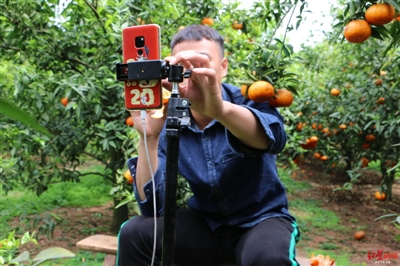 直播地點選在了橘子地里,直播的同時,助手從樹上采摘,保證網(wǎng)友見到的都是新鮮采摘。