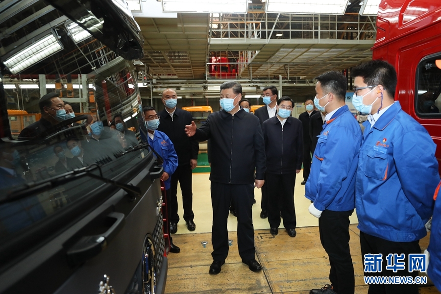 4月20日至23日,中共中央總書記、國(guó)家主席、中央軍委主席習(xí)近平在陜西考察。這是4月22日,習(xí)近平在陜西汽車控股集團(tuán)有限公司總裝車間察看生產(chǎn)線,了解產(chǎn)品研發(fā)、生產(chǎn)、銷售和復(fù)工復(fù)產(chǎn)情況。 新華社記者 鞠鵬 攝