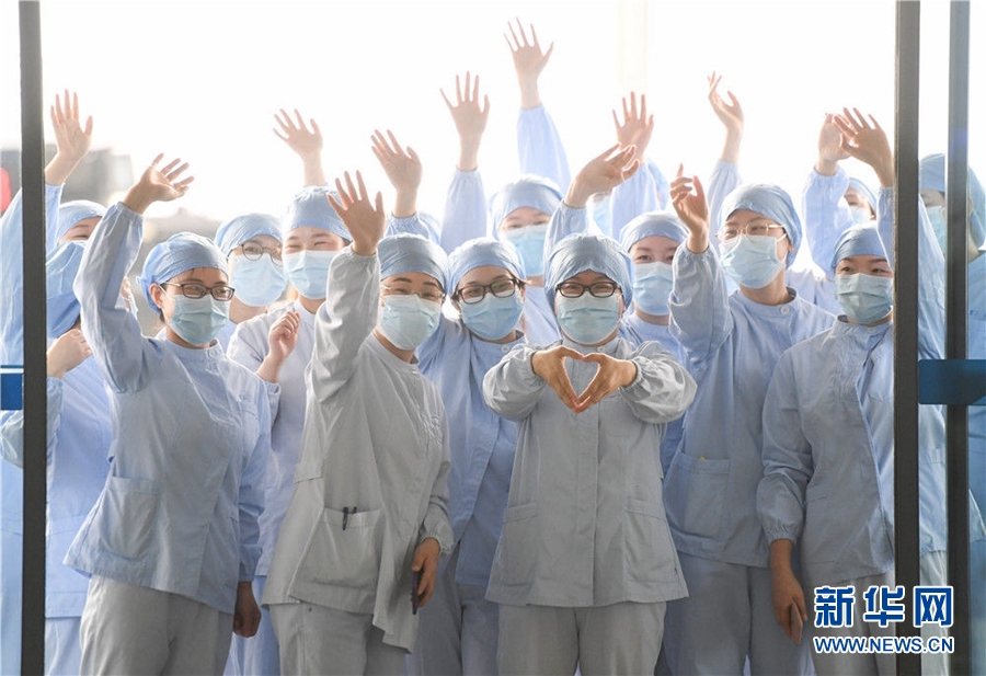 3月18日,在韓國(guó)大邱啟明大學(xué)東山醫(yī)院,醫(yī)護(hù)人員對(duì)記者擺出勝利手勢(shì)。新華社發(fā)(李相浩攝)
