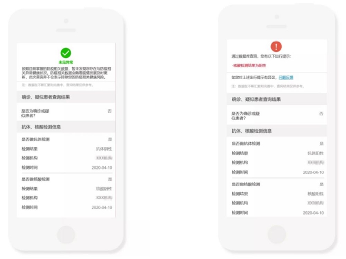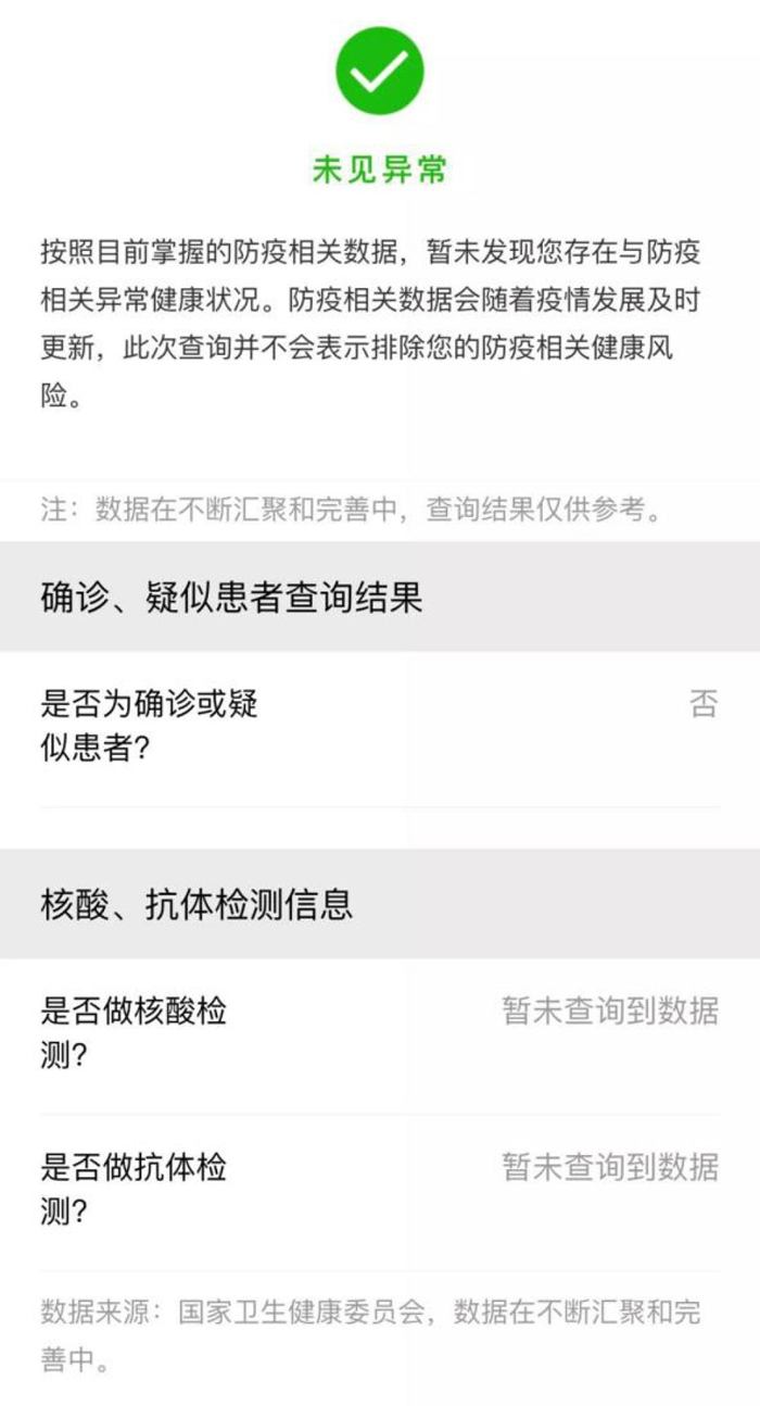 此外,核酸和抗體檢測結(jié)果信息還納入了全國一體化平臺“防疫健康信息碼”服務(wù)。用戶可通過國家政務(wù)服務(wù)平臺微信、支付寶、百度小程序,根據(jù)操作指引申領(lǐng)國家平臺的“防疫健康信息碼”,“防疫健康信息碼”會如實反映本人7天內(nèi)核酸及抗體檢測結(jié)果。如核酸檢測結(jié)果為陰性,則防疫健康風(fēng)險狀態(tài)顯示“未見異?!薄H绾怂釞z測結(jié)果為陽性,則會出現(xiàn)“核酸檢測結(jié)果為陽性”的出行提示。如果7天內(nèi)未做過核酸及抗體檢測,防疫健康信息會根據(jù)個人當(dāng)前提供的相關(guān)數(shù)據(jù)顯示健康風(fēng)險結(jié)果。