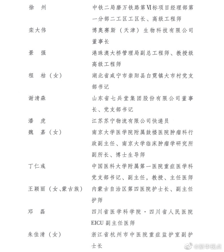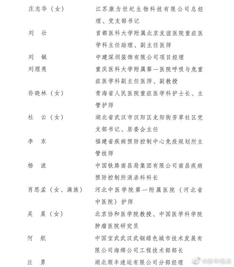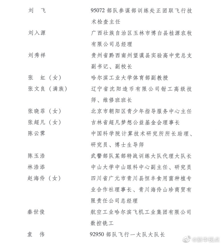 榮獲第24屆“中國青年五四獎(jiǎng)?wù)隆钡姆謩e是:江蘇省南京市鼓樓區(qū)方家營消防救援站站長助理、三級(jí)消防長丁良浩,安徽省滁州市定遠(yuǎn)縣吳圩鎮(zhèn)西孔村黨總支第一書記王萌萌(女),廈門大學(xué)航空航天學(xué)院常務(wù)副院長、特聘教授、博士生導(dǎo)師尤延鋮,湖北省黃岡市羅田縣希望小學(xué)校長方榮(女),浙江每日互動(dòng)網(wǎng)絡(luò)科技股份有限公司董事長兼總經(jīng)理、黨委書記方毅,浙江省杭州市拱墅區(qū)職業(yè)高級(jí)中學(xué)美發(fā)專業(yè)教師石丹(女),國家超級(jí)計(jì)算無錫中心副主任付昊桓,中國石油大港油田公司第二采油廠作業(yè)二區(qū)注采二組副組長馮萌萌(女),寧夏回族自治區(qū)石嘴山市中醫(yī)醫(yī)院副主任醫(yī)師朱斌,中國國家女子排球隊(duì)隊(duì)員、隊(duì)長朱婷(女),95072部隊(duì)參謀部訓(xùn)練處正團(tuán)職飛行技術(shù)檢查主任劉飛,廣西壯族自治區(qū)玉林市博白縣桂源農(nóng)牧有限公司總經(jīng)理劉入源,貴州省黔西南州望謨縣實(shí)驗(yàn)高中黨總支副書記、副校長劉秀祥,哈爾濱工業(yè)大學(xué)體育部副教授張虹(女),遼寧省沈陽造幣有限公司鉗工高級(jí)技師、維修班班長張文良(滿族),北京市朝陽區(qū)青少年指導(dǎo)服務(wù)中心主任張曉菲(女),吉林省超凡夢想公益基金會(huì)理事長張超凡(女),中國科學(xué)院計(jì)算技術(shù)研究所所長助理、研究員、博士生導(dǎo)師陳云霽,武警部隊(duì)某部特戰(zhàn)訓(xùn)練大隊(duì)代理大隊(duì)長陳玉浩,中山大學(xué)中山眼科中心副主任、研究員林浩添,四川省廣元市青川縣恒豐食用菌種植專業(yè)合作社理事長、青川海伶山珍商貿(mào)有限責(zé)任公司總經(jīng)理趙海伶(女),航空工業(yè)哈爾濱飛機(jī)工業(yè)集團(tuán)有限公司數(shù)控銑工秦世俊,92950部隊(duì)飛行一大隊(duì)大隊(duì)長袁偉,中鐵二局磨萬鐵路第Ⅵ標(biāo)項(xiàng)目經(jīng)理部第一分部二工區(qū)工區(qū)長、高級(jí)工程師徐州,博奧賽斯(天津)生物科技有限公司董事長欒大偉,港珠澳大橋管理局副總工程師、教授級(jí)高級(jí)工程師景強(qiáng),湖北省咸寧市崇陽縣白霓鎮(zhèn)大市村黨支部書記程桔(女),山東省七兵堂集團(tuán)股份有限公司董事長、黨支部書記謝清森,江蘇蘇寧物流有限公司快遞員潘虎,南京大學(xué)醫(yī)學(xué)院附屬鼓樓醫(yī)院腫瘤科行政副主任、南京大學(xué)臨床腫瘤學(xué)研究所副所長、博士生導(dǎo)師魏嘉(女),中國醫(yī)科大學(xué)附屬第一醫(yī)院重癥醫(yī)學(xué)科黨支部書記、副主任,教授、主任醫(yī)師丁仁彧,內(nèi)蒙古自治區(qū)第四醫(yī)院護(hù)士長、副主任護(hù)師王穎麗(女、蒙古族),四川省醫(yī)學(xué)科學(xué)院·四川省人民醫(yī)院EICU副主任醫(yī)師鄧?yán)?,浙江省杭州市中醫(yī)院重癥監(jiān)護(hù)室副護(hù)士長朱佳清(女),江蘇康為世紀(jì)生物科技有限公司總經(jīng)理、黨支部書記莊志華(女),首都醫(yī)科大學(xué)附屬北京友誼醫(yī)院重癥醫(yī)學(xué)科主任助理、副主任醫(yī)師劉壯,中建深圳裝飾有限公司項(xiàng)目經(jīng)理劉鋮,重慶醫(yī)科大學(xué)附屬第一醫(yī)院呼吸與危重癥醫(yī)學(xué)科副主任醫(yī)師、副教授劉煜亮,青海省人民醫(yī)院重癥醫(yī)學(xué)科護(hù)士長、主管護(hù)師孫曉林(女),湖北省武漢市漢陽區(qū)龍陽街芳草社區(qū)黨支部書記、居委會(huì)主任杜云(女),福建省疾病預(yù)防控制中心免疫規(guī)劃所主管技師李東,中國鐵路南昌局集團(tuán)有限公司南昌疾病預(yù)防控制所消殺科科長楊波,河北中醫(yī)學(xué)院第一附屬醫(yī)院(河北省中醫(yī)院)護(hù)師肖思孟(女、滿族),北京協(xié)和醫(yī)學(xué)院教授、中國醫(yī)學(xué)科學(xué)院腫瘤醫(yī)院研究員吳晨(女),中國寶武武漢武鋼綠色城市技術(shù)發(fā)展有限公司海綿公司工程技術(shù)部部長何航,湖北順豐速運(yùn)有限公司分部經(jīng)理汪勇,天津醫(yī)科大學(xué)總醫(yī)院呼吸與危重癥醫(yī)學(xué)科監(jiān)護(hù)室護(hù)士長沈悅好(女),西安交通大學(xué)第二附屬醫(yī)院急診科副主任、副主任醫(yī)師張正良,青島大學(xué)附屬醫(yī)院麻醉科主治醫(yī)師張孝田,湖南省湘潭市第一人民醫(yī)院重癥醫(yī)學(xué)科主任、副主任醫(yī)師易釗泉,湖南省懷化市志愿者協(xié)會(huì)副秘書長羅小小,華中科技大學(xué)同濟(jì)醫(yī)學(xué)院附屬同濟(jì)醫(yī)院心內(nèi)科副教授、副主任醫(yī)師周寧,甘肅藍(lán)天救援隊(duì)理事長、隊(duì)長於若飛,武漢大學(xué)中南醫(yī)院感染科護(hù)士長、主管護(hù)師胡慧(女),遼寧省沈陽橡膠研究設(shè)計(jì)院有限公司研發(fā)中心基礎(chǔ)理論與材料研究主任工程師姚秀超,山西醫(yī)科大學(xué)第一醫(yī)院神經(jīng)內(nèi)科護(hù)士長、主管護(hù)師唐珊(女),湖北省武漢市公安局江漢區(qū)分局警務(wù)指揮處民警涂可藹(土家族),廣州醫(yī)科大學(xué)附屬第一醫(yī)院重癥醫(yī)學(xué)科副主任醫(yī)師桑嶺,湖北省武漢市第三醫(yī)院重癥醫(yī)學(xué)科副主任醫(yī)師董芳(女),東南大學(xué)附屬中大醫(yī)院重癥醫(yī)學(xué)科主任醫(yī)師潘純。