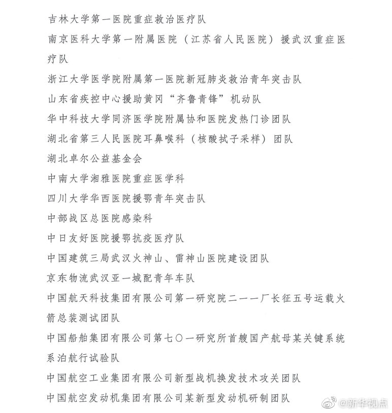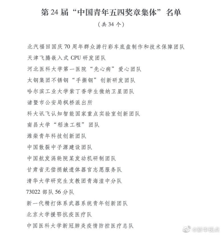 榮獲“中國青年五四獎(jiǎng)?wù)录w”的分別是:北汽福田國慶70周年群眾游行彩車底盤制作和技術(shù)保障團(tuán)隊(duì),天津飛騰嵌入式CPU研發(fā)團(tuán)隊(duì),河北醫(yī)科大學(xué)第一醫(yī)院“先心病”愛心團(tuán)隊(duì),太鋼集團(tuán)不銹鋼“手撕鋼”創(chuàng)新研發(fā)團(tuán)隊(duì),哈爾濱工業(yè)大學(xué)紫丁香學(xué)生微納衛(wèi)星團(tuán)隊(duì),諸暨市公安局楓橋派出所,科大訊飛認(rèn)知智能國家重點(diǎn)實(shí)驗(yàn)室創(chuàng)新團(tuán)隊(duì),南昌大學(xué)“稻漁工程”團(tuán)隊(duì),濰柴青年科技創(chuàng)新團(tuán)隊(duì),中國散裂中子源建設(shè)團(tuán)隊(duì),中國航發(fā)渦輪院某發(fā)動(dòng)機(jī)研制團(tuán)隊(duì),甘肅省無償捐獻(xiàn)遺體器官志愿服務(wù)隊(duì),清華大學(xué)研究生支教團(tuán)青海湟中分隊(duì),73022部隊(duì)56分隊(duì),新一代精打體系武器系統(tǒng)青年創(chuàng)新團(tuán)隊(duì),北京大學(xué)援鄂抗疫醫(yī)療隊(duì),中國醫(yī)科大學(xué)新冠肺炎疫情防控醫(yī)療總隊(duì),吉林大學(xué)第一醫(yī)院重癥救治醫(yī)療隊(duì),南京醫(yī)科大學(xué)第一附屬醫(yī)院(江蘇省人民醫(yī)院)援武漢重癥醫(yī)療隊(duì),浙江大學(xué)醫(yī)學(xué)院附屬第一醫(yī)院新冠肺炎救治青年突擊隊(duì),山東省疾控中心援助黃岡“齊魯青鋒”機(jī)動(dòng)隊(duì),華中科技大學(xué)同濟(jì)醫(yī)學(xué)院附屬協(xié)和醫(yī)院發(fā)熱門診團(tuán)隊(duì),湖北省第三人民醫(yī)院耳鼻喉科(核酸拭子采樣)團(tuán)隊(duì),湖北卓爾公益基金會(huì),中南大學(xué)湘雅醫(yī)院重癥醫(yī)學(xué)科,四川大學(xué)華西醫(yī)院援鄂青年突擊隊(duì),中部戰(zhàn)區(qū)總醫(yī)院感染科,中日友好醫(yī)院援鄂抗疫醫(yī)療隊(duì),中國建筑三局武漢火神山、雷神山醫(yī)院建設(shè)團(tuán)隊(duì),京東物流武漢亞一城配青年車隊(duì),中國航天科技集團(tuán)有限公司第一研究院二一一廠長征五號(hào)運(yùn)載火箭總裝測試團(tuán)隊(duì),中國船舶集團(tuán)有限公司第七〇一研究所首艘國產(chǎn)航母某關(guān)鍵系統(tǒng)系泊航行試驗(yàn)隊(duì),中國航空工業(yè)集團(tuán)有限公司新型戰(zhàn)機(jī)換發(fā)技術(shù)攻關(guān)團(tuán)隊(duì),中國航空發(fā)動(dòng)機(jī)集團(tuán)有限公司某新型發(fā)動(dòng)機(jī)研制團(tuán)隊(duì)。