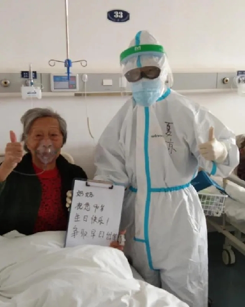 △3月18日,武漢大學(xué)人民醫(yī)院東院區(qū)新冠肺炎21病區(qū),醫(yī)務(wù)人員為90歲的周太婆祝壽。
