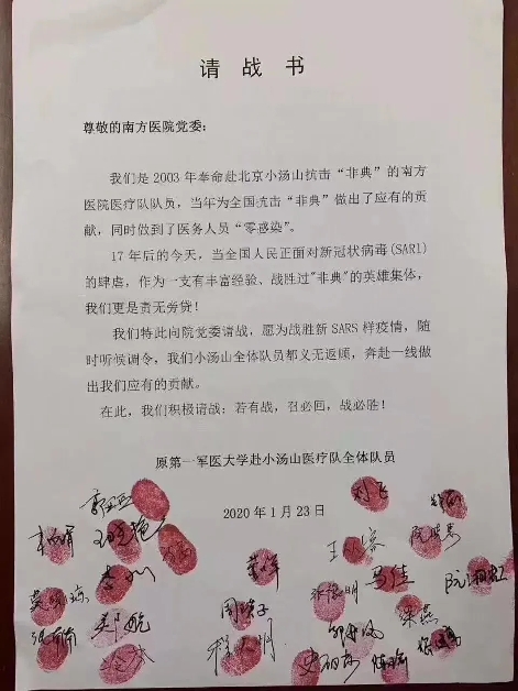 △1月23日,曾參加原第一軍醫(yī)大學(xué)赴小湯山醫(yī)療隊(duì)的南方醫(yī)院24名醫(yī)護(hù)人員寫下請(qǐng)戰(zhàn)書,主動(dòng)要求赴一線工作。