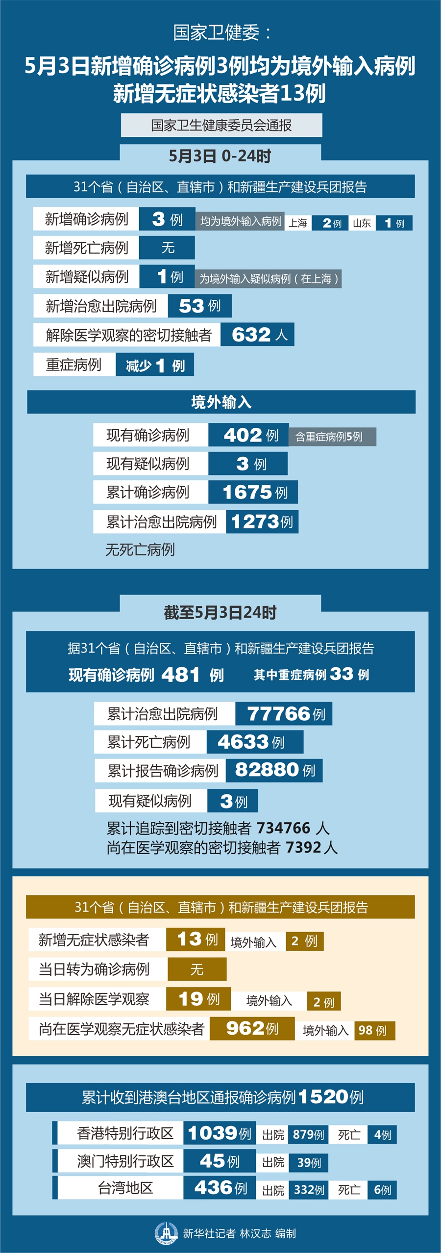 截至5月3日24時(shí),據(jù)31個(gè)省(自治區(qū)、直轄市)和新疆生產(chǎn)建設(shè)兵團(tuán)報(bào)告,現(xiàn)有確診病例481例(其中重癥病例33例),累計(jì)治愈出院病例77766例,累計(jì)死亡病例4633例,累計(jì)報(bào)告確診病例82880例,現(xiàn)有疑似病例3例。累計(jì)追蹤到密切接觸者734766人,尚在醫(yī)學(xué)觀察的密切接觸者7392人。