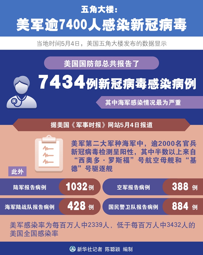 新華社華盛頓5月4日電(記者徐劍梅 鄧仙來(lái))美國(guó)五角大樓4日發(fā)布的數(shù)據(jù)顯示,截至目前,美國(guó)國(guó)防部總共報(bào)告了7434例新冠病毒感染病例,其中海軍感染情況最為嚴(yán)重。