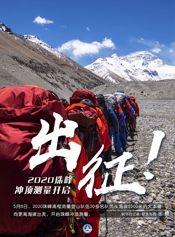6日,2020珠峰高程測(cè)量行動(dòng)測(cè)量登山隊(duì)舉行出發(fā)儀式,30多名計(jì)劃登頂?shù)臏y(cè)量登山隊(duì)員當(dāng)日從海拔5200米的珠峰登山大本營(yíng)向更高海拔出發(fā),計(jì)劃抓住近日的天氣窗口,擇日登頂測(cè)量。如果成功,這將成為我國(guó)專業(yè)測(cè)繪人員首次登頂珠峰測(cè)高。