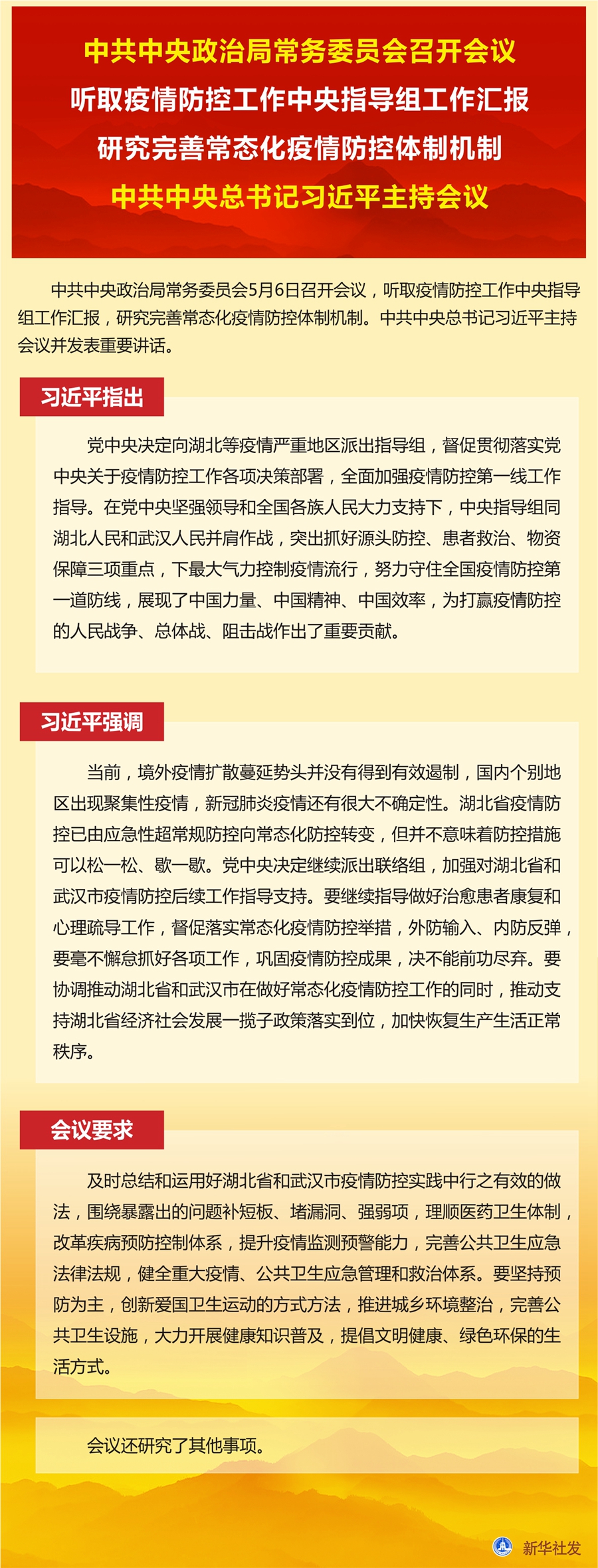 新華社北京5月6日電 中共中央政治局常務委員會5月6日召開會議,聽取疫情防控工作中央指導組工作匯報,研究完善常態(tài)化疫情防控體制機制。中共中央總書記習近平主持會議并發(fā)表重要講話。