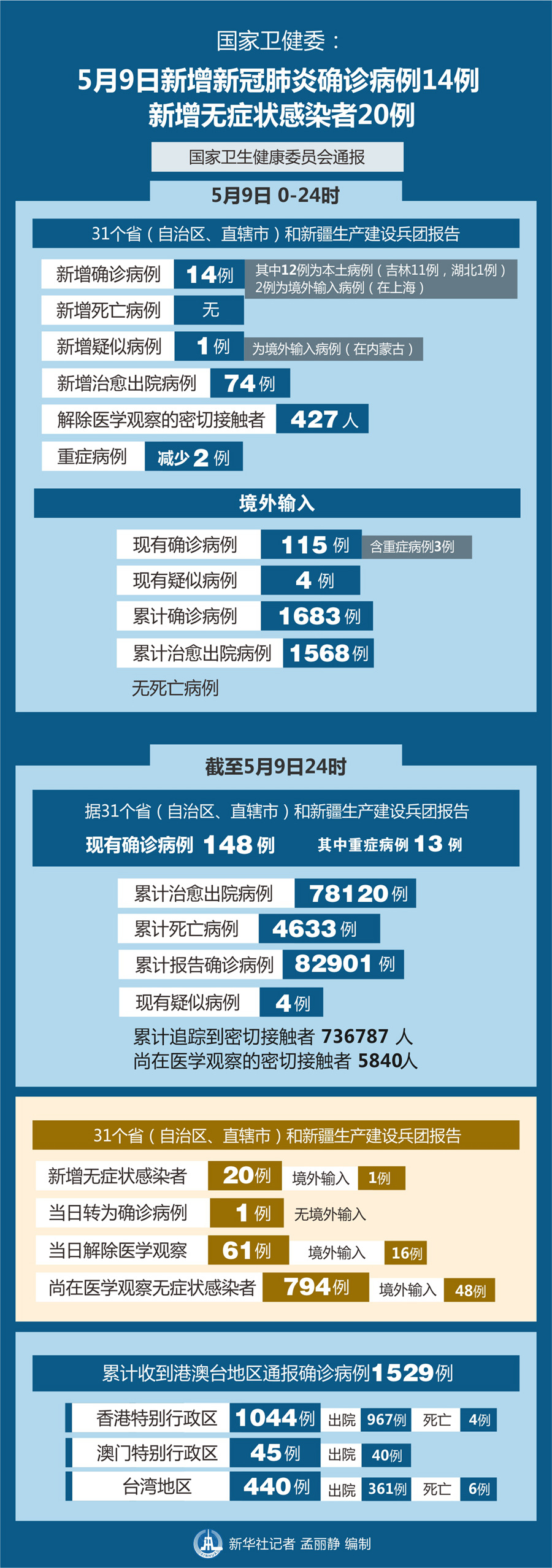 截至5月9日24時,據(jù)31個?。ㄗ灾螀^(qū)、直轄市)和新疆生產(chǎn)建設(shè)兵團報告,現(xiàn)有確診病例148例(其中重癥病例13例),累計治愈出院病例78120例,累計死亡病例4633例,累計報告確診病例82901例,現(xiàn)有疑似病例4例。累計追蹤到密切接觸者736787人,尚在醫(yī)學(xué)觀察的密切接觸者5840人。
