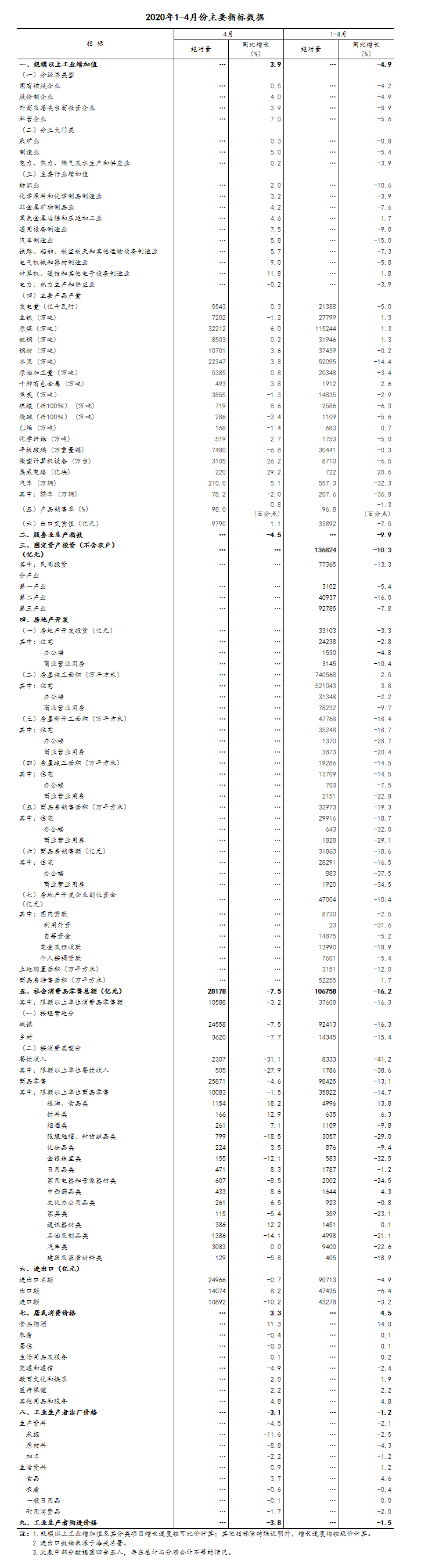 4月份,全國規(guī)模以上工業(yè)增加值同比增長3.9%,3月份為下降1.1%;環(huán)比增長2.27%。1-4月份,全國規(guī)模以上工業(yè)增加值同比下降4.9%,降幅比1-3月份收窄3.5個百分點。4月份,分經濟類型看,國有控股企業(yè)增加值增長0.5%;股份制企業(yè)增長4.0%,外商及港澳臺商投資企業(yè)增長3.9%;私營企業(yè)增長7.0%。分三大門類看,采礦業(yè)增加值增長0.3%;制造業(yè)增長5.0%,3月份為下降1.8%;電力、熱力、燃氣及水生產和供應業(yè)增長0.2%。高技術制造業(yè)和裝備制造業(yè)增長較快。4月份,高技術制造業(yè)和裝備制造業(yè)增加值分別增長10.5%和9.3%,快于規(guī)模以上工業(yè)6.6和5.4個百分點。從產品產量看,光纜,挖掘、鏟土運輸機械,集成電路,工業(yè)機器人,微型計算機設備產量同比分別增長43.8%、40.8%、29.2%、26.6%、26.2%。