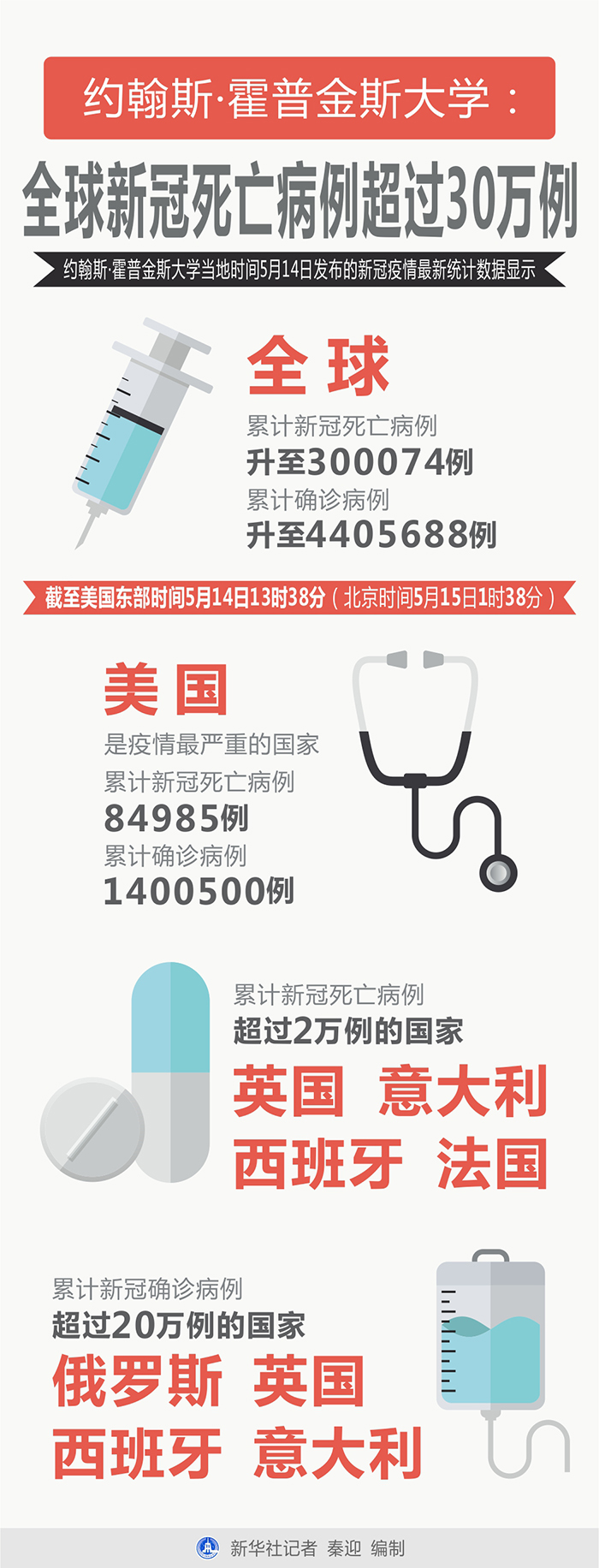 美國約翰斯·霍普金斯大學(xué):截至美國東部時間14日13時38分(北京時間15日1時38分),全球累計確診新冠病例增至4405688例,累計死亡病例增至300074例;美國是疫情最嚴(yán)重的國家,累計確診1400500例,累計死亡84985例。
