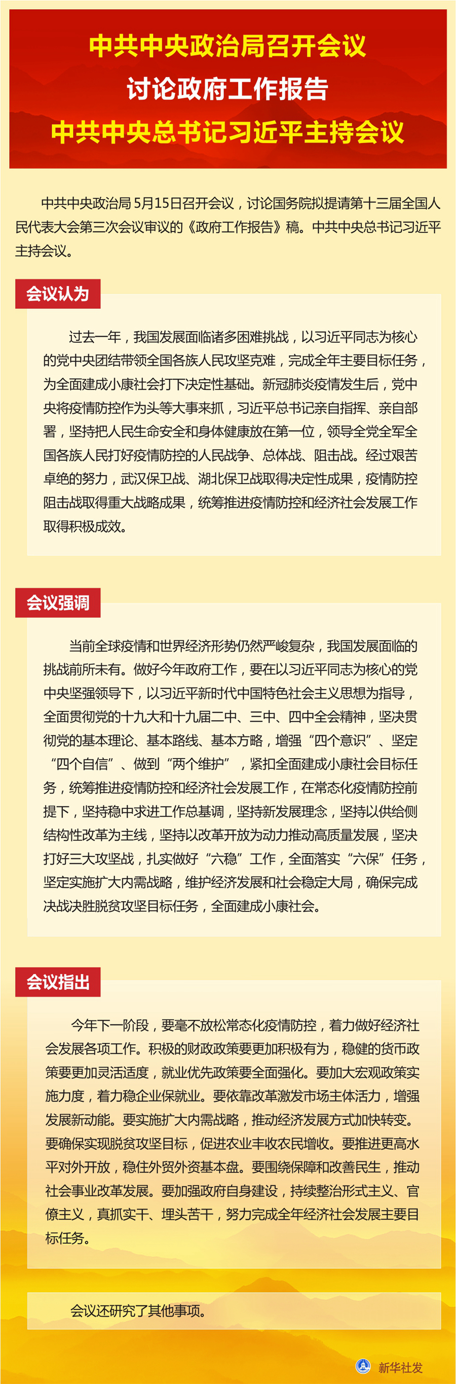新華社北京5月15日電 中共中央政治局5月15日召開會議,討論國務(wù)院擬提請第十三屆全國人民代表大會第三次會議審議的《政府工作報告》稿。中共中央總書記習(xí)近平主持會議。