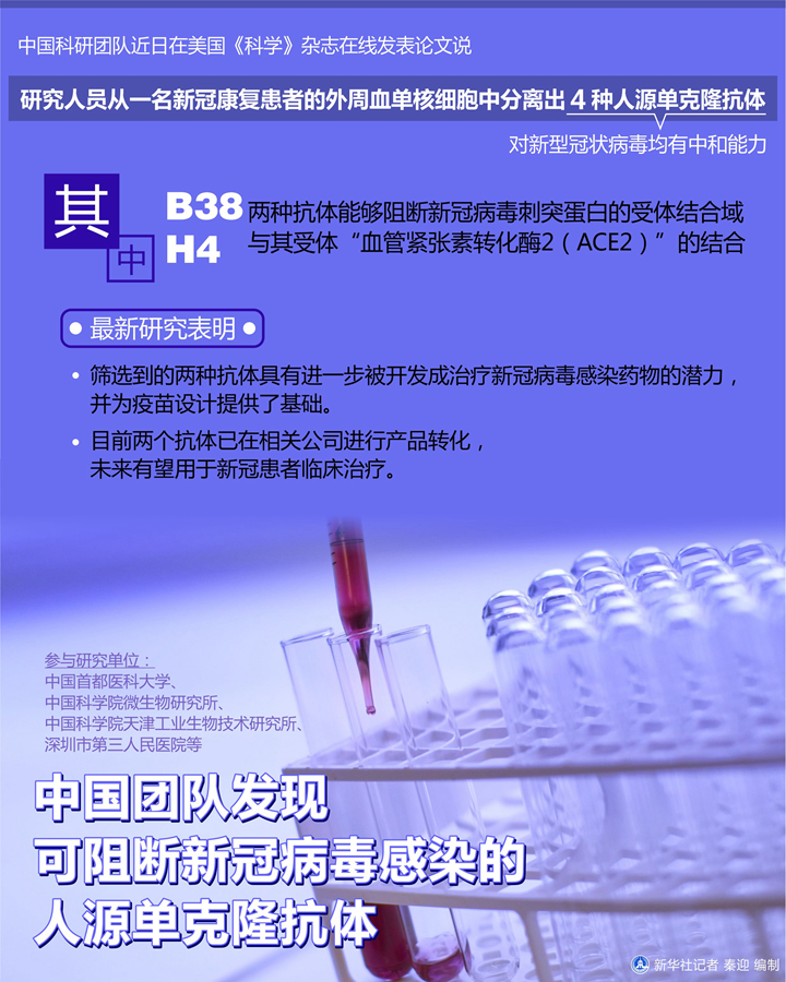 圖表:中國(guó)團(tuán)隊(duì)發(fā)現(xiàn)可阻斷新冠病毒感染的人源單克隆抗體 新華社記者 秦迎 編制