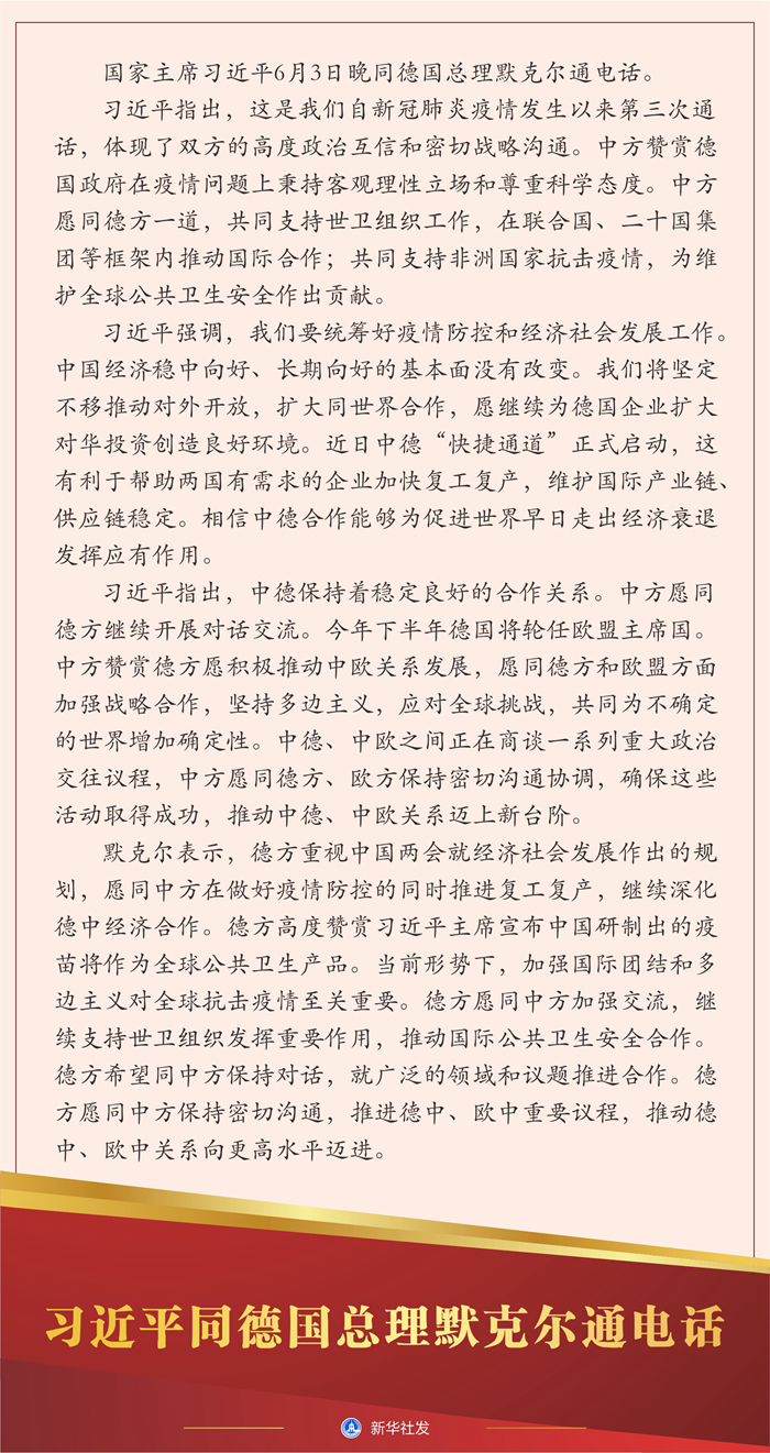 新華社北京6月3日電? 國家主席習(xí)近平6月3日晚同德國總理默克爾通電話。