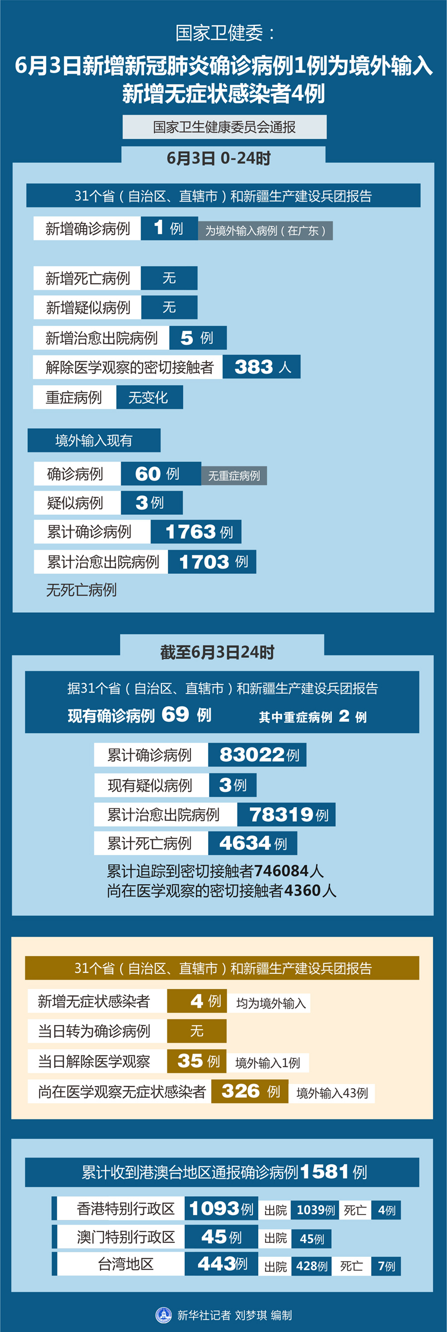 截至6月3日24時(shí),據(jù)31個(gè)?。ㄗ灾螀^(qū)、直轄市)和新疆生產(chǎn)建設(shè)兵團(tuán)報(bào)告,現(xiàn)有確診病例69例(其中重癥病例2例),累計(jì)治愈出院病例78319例,累計(jì)死亡病例4634例,累計(jì)報(bào)告確診病例83022例,現(xiàn)有疑似病例3例。累計(jì)追蹤到密切接觸者746084人,尚在醫(yī)學(xué)觀察的密切接觸者4360人。
