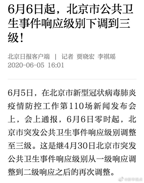 6月5日,在北京市新型冠狀病毒肺炎疫情防控工作第110場新聞發(fā)布會上,會上通報(bào),6月6日零時(shí)起,北京市突發(fā)公共衛(wèi)生事件響應(yīng)級別調(diào)整至三級。這是繼4月30日北京市突發(fā)公共衛(wèi)生事件響應(yīng)級別從一級響應(yīng)調(diào)整到二級響應(yīng)之后的再次調(diào)整。?