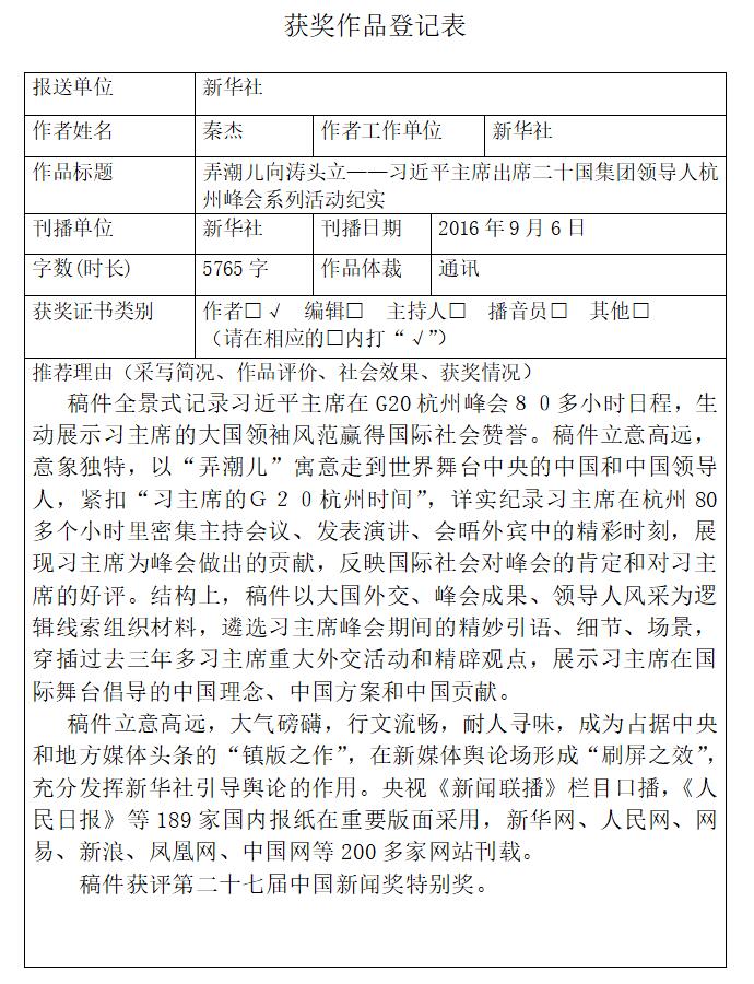 秦杰同志長(zhǎng)期承擔(dān)中央主要領(lǐng)導(dǎo)同志的采訪報(bào)道任務(wù)。無(wú)論在條件艱苦的青藏高原,還是在行程萬(wàn)里日程頻密的高訪之中,他都能不辭辛苦、日夜奮戰(zhàn),以高度的政治責(zé)任感和精益求精的職業(yè)精神出色完成任務(wù)。他參與采寫(xiě)的《更高舉起改革開(kāi)放偉大旗幟——寫(xiě)在鄧小平同志誕辰110周年之際》和牽頭采寫(xiě)的《弄潮兒向濤頭立——習(xí)近平主席出席二十國(guó)集團(tuán)領(lǐng)導(dǎo)人杭州峰會(huì)系列活動(dòng)紀(jì)實(shí)》獲得中國(guó)新聞最高獎(jiǎng)——中國(guó)新聞獎(jiǎng)特別獎(jiǎng),參與撰寫(xiě)的《中共高層新陣容》被譽(yù)為中國(guó)領(lǐng)導(dǎo)人對(duì)外報(bào)道的開(kāi)創(chuàng)性作品并獲中國(guó)新聞獎(jiǎng)一等獎(jiǎng)。他采寫(xiě)的《歷史見(jiàn)證承諾》《一枝一葉總關(guān)情》等報(bào)道成為時(shí)政報(bào)道領(lǐng)域不可多得的精品。
